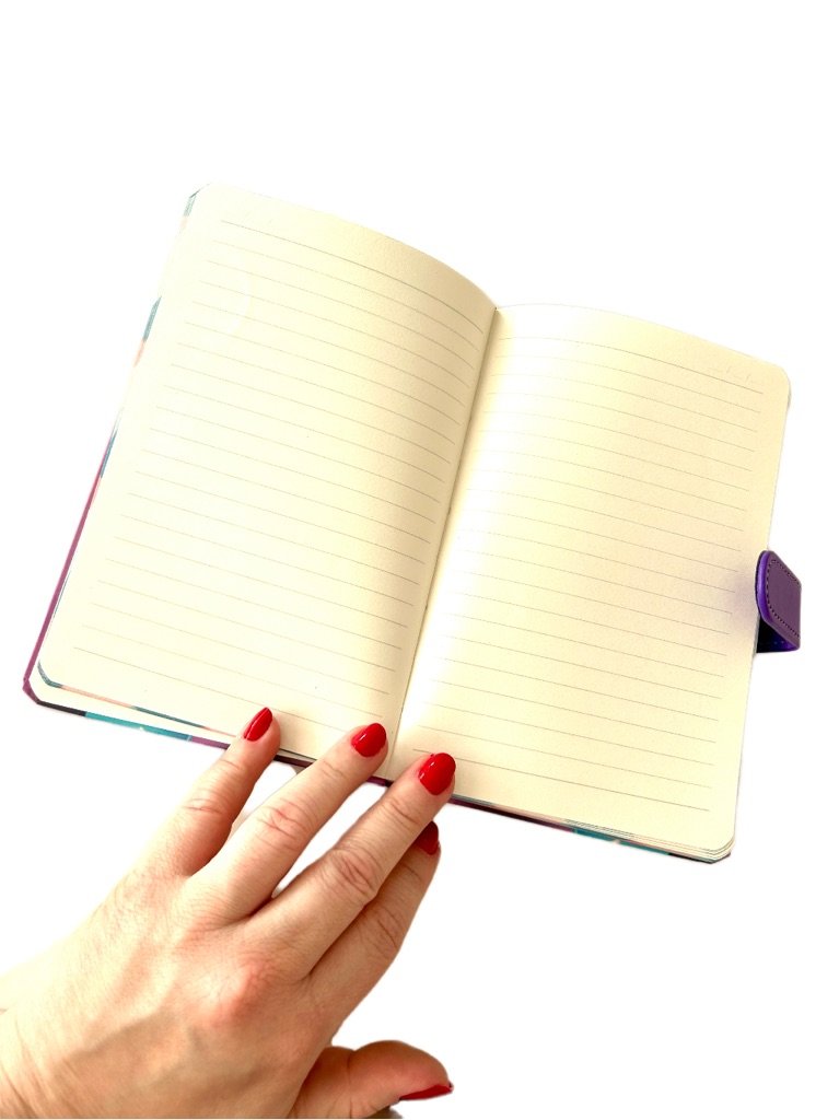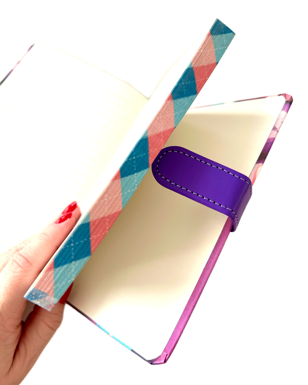 O fechamento magnético com aba roxa adiciona um toque moderno e funcional, mantendo suas páginas protegidas com charme.