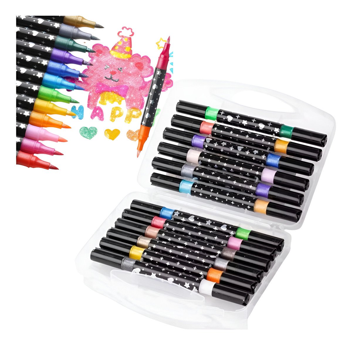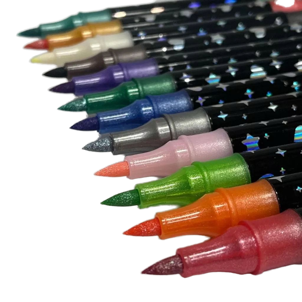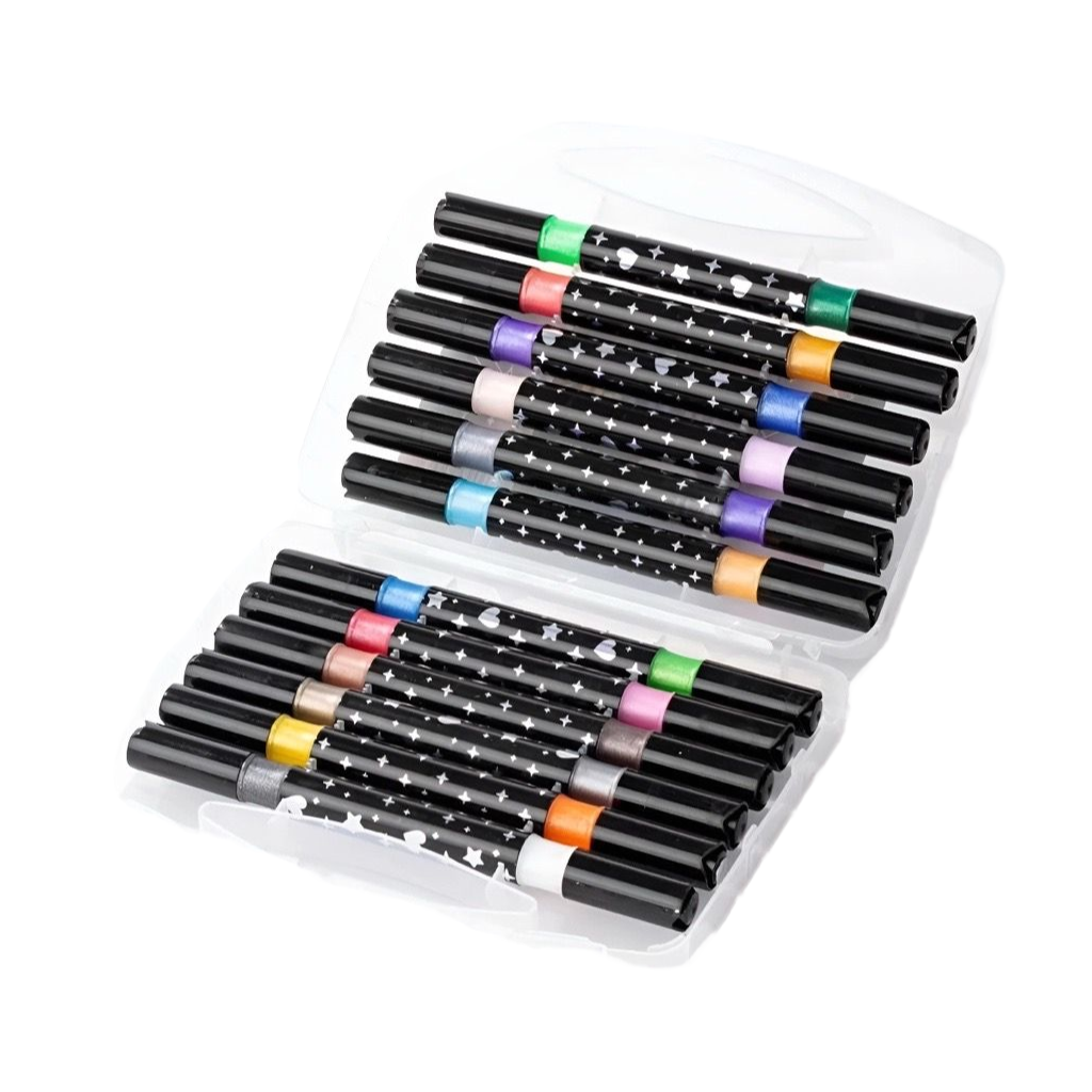 A ponta dupla é uma característica que facilita a criação de detalhes finos e traços mais largos, proporcionando a liberdade de expressão artística. A fórmula brilhante das tintas garante que cada criação se destaque, com cores que se mantêm intensas e duradouras.