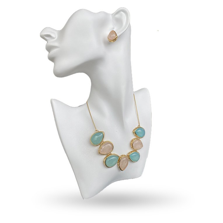 O Conjunto Sea é uma verdadeira ode à natureza e à sua beleza incomparável, trazendo para suas joias a serenidade e o fascínio dos oceanos. Composto por uma elegante gargantilha e brincos, o conjunto destaca-se pela combinação harmoniosa de pedras de quartzo verde e rosa, emolduradas pelo brilho dourado do banho a ouro. Cada detalhe dessas peças foi cuidadosamente pensado para capturar a tranquilidade e a majestade do mar em seu momento mais sereno: o amanhecer.