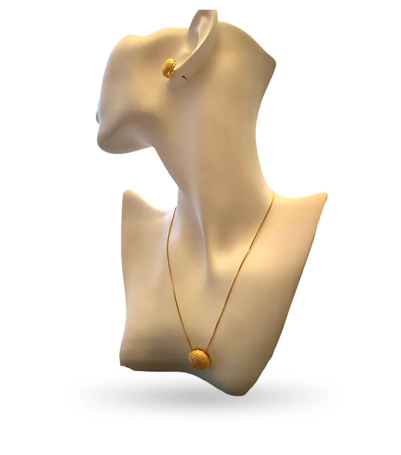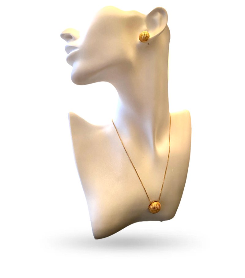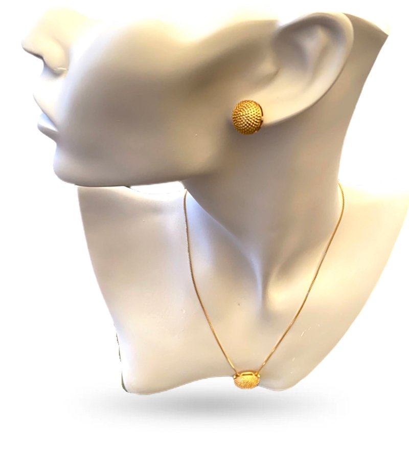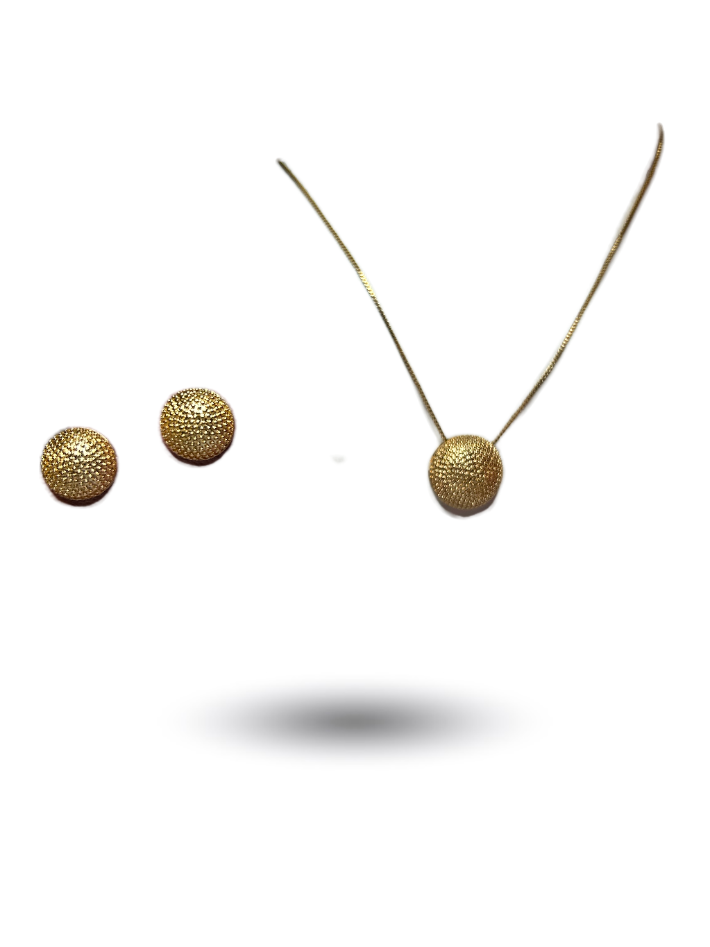 Ambas as joias são banhadas a ouro, conferindo um brilho luxuoso e atemporal que se reflete a cada movimento. A superfície de cada peça é adornada por minúsculos pontinhos arredondados, meticulosamente dispostos com uma precisão encantadora, como pequenas estrelas que brilham em uma noite serena. Esses detalhes sutis, mas profundos, adicionam um toque de refinamento e sofisticação, criando um efeito visual de leveza e elegância, como se cada ponto fosse uma estrela reluzente no vasto céu noturno.