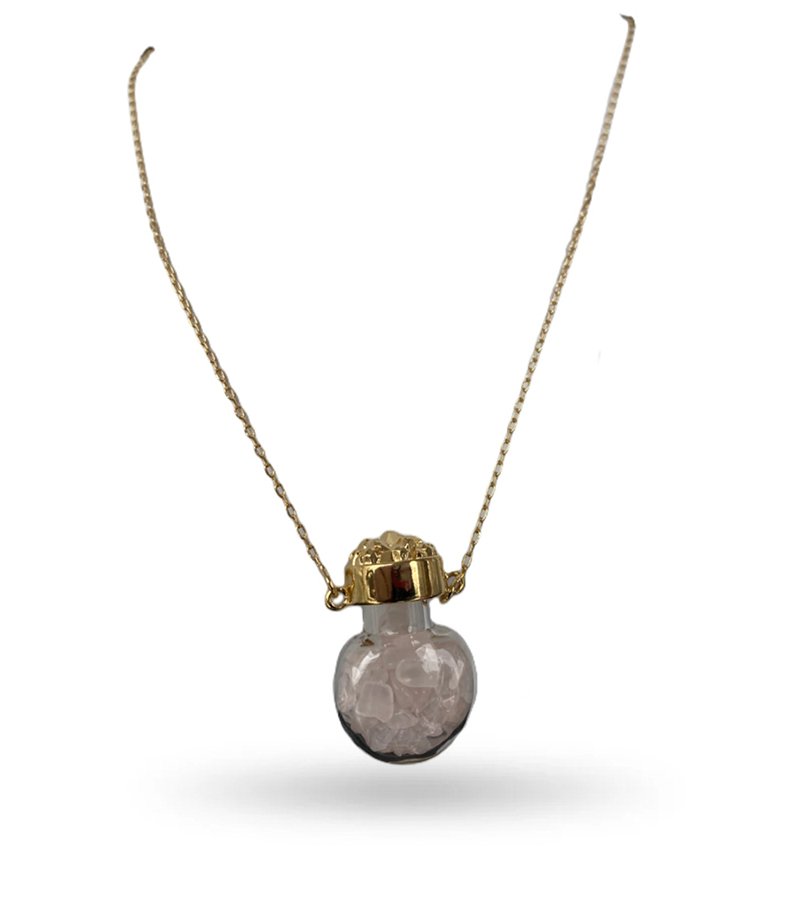 O destaque dessa joia singular é seu pingente encantador, uma minúscula garrafinha de vidro que parece conter dentro de si a própria essência da natureza. No interior, repousam cristais preciosos de quartzo verde, quartzo rosa e ametista, cada um carregando significados profundos de cura, amor e espiritualidade. Essas pequenas gemas brilham com uma intensidade quase mágica, refletindo a luz em suaves lampejos coloridos, como se cada cristal guardasse em si um fragmento de sonho.