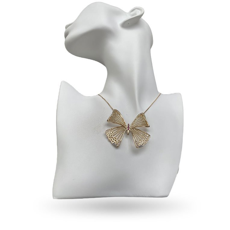 O destaque da peça é a borboleta dourada central, símbolo de transformação e liberdade, que confere um significado especial à joia. Suas asas são decoradas com minúsculas pedrinhas de zircônia, cada uma meticulosamente lapidada e cravejada para maximizar o brilho. Esses pequenos cristais capturam a luz em todas as direções, criando um efeito cintilante que remete à magia de um céu estrelado.