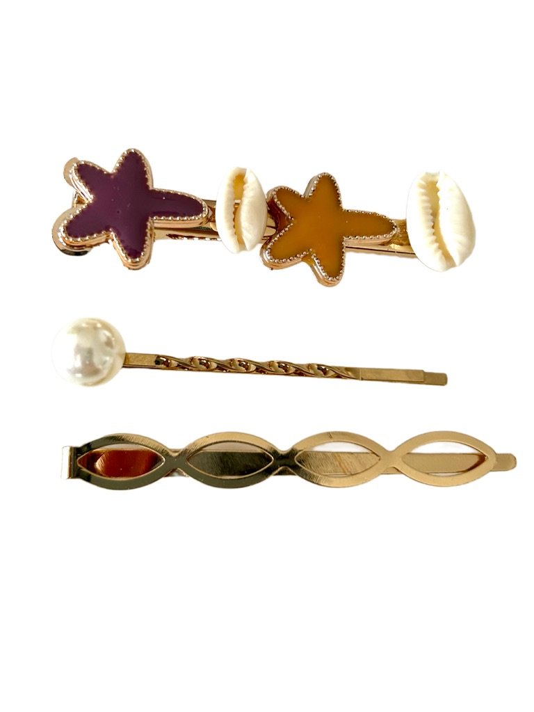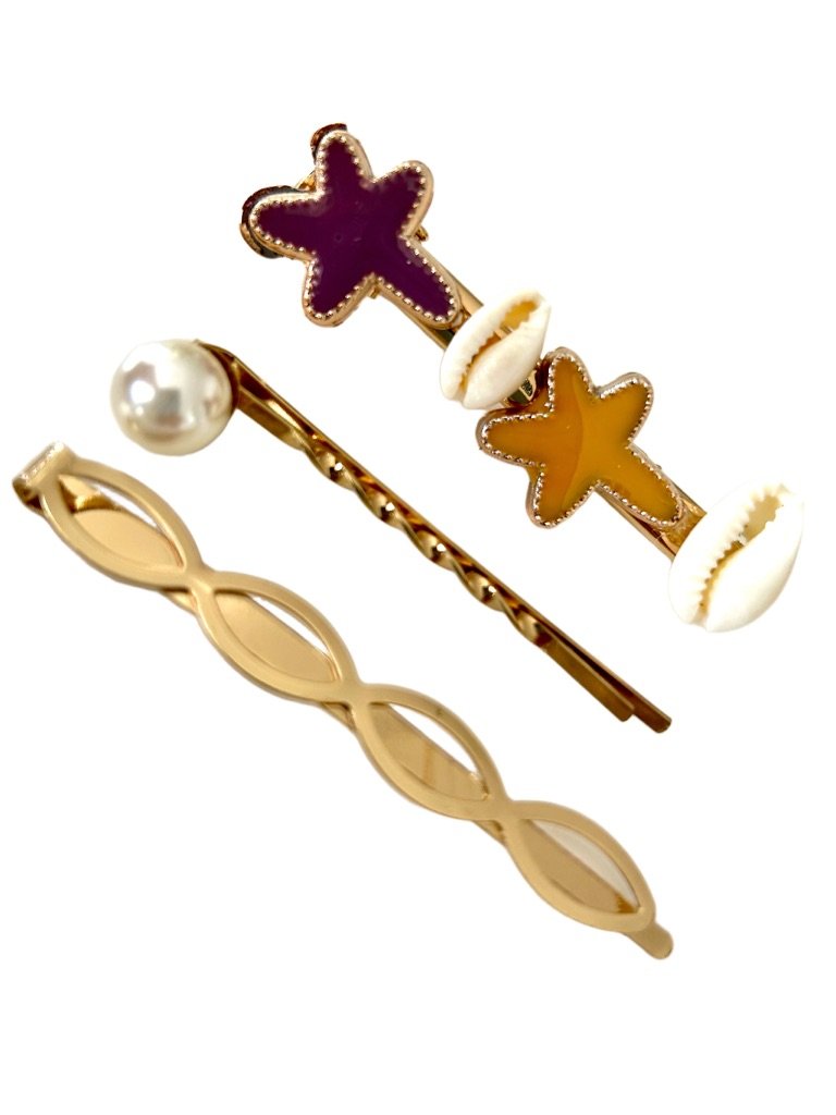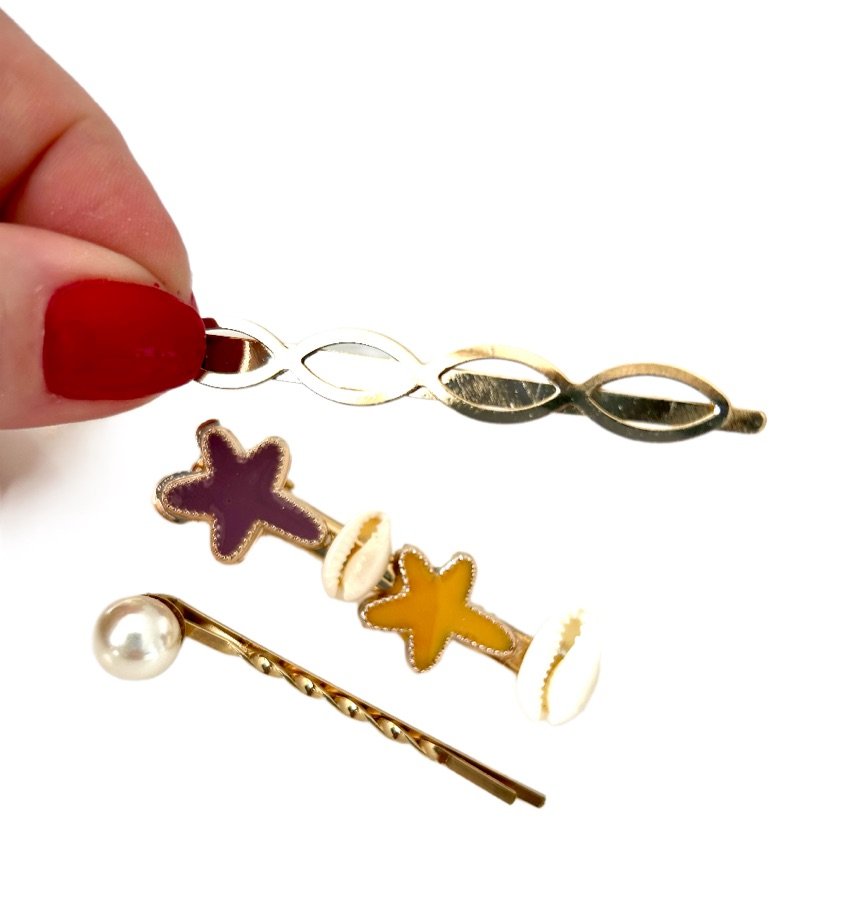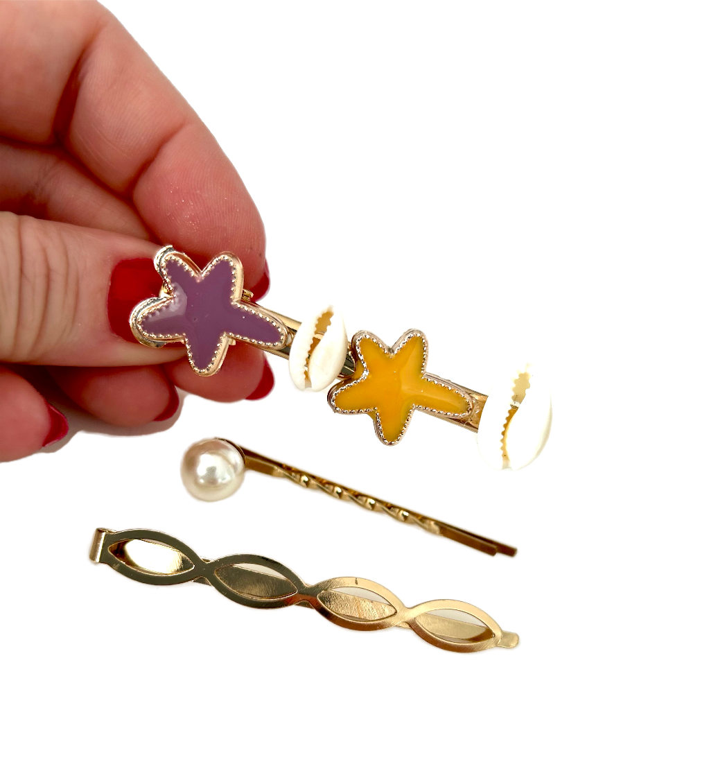 Um toque de mar, luz e delicadeza. O Seashell Dreams traz três presilhas que combinam o brilho dourado editorial com elementos que lembram a poesia do oceano: estrelas-do-mar esmaltadas, búzios naturais e detalhes minimalistas em pérola. Um trio versátil para iluminar o seu cabelo com charme litorâneo e elegância Navillera — suave, feminino e cheio de personalidade.